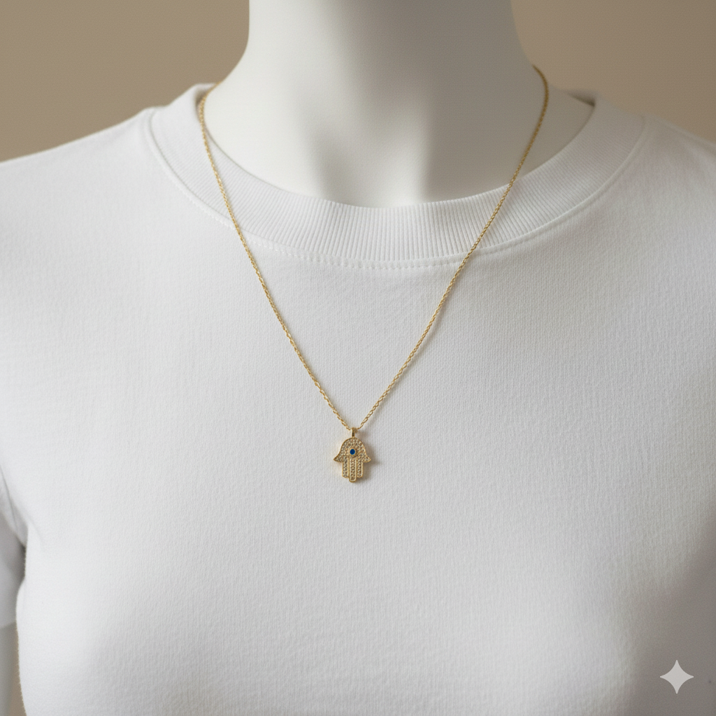 925 Sterling Silver Hamsa Necklace – Gold Plated CZ Evil Eye Hand Pendant, Dainty Protection Jewelry
