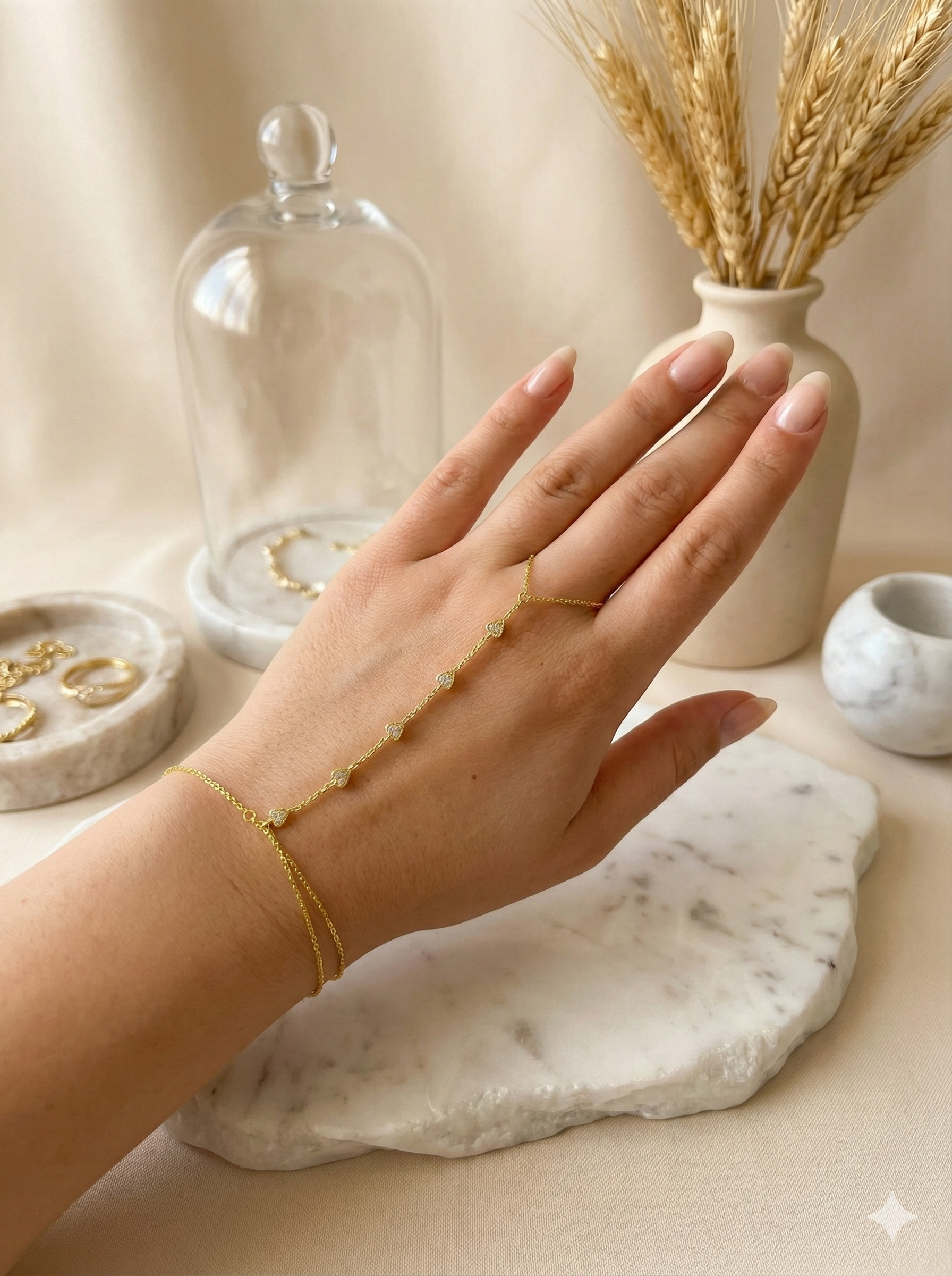 This hand chain brings a graceful sparkle to every movement — delicate, modern, and beautifully refined. A must-have accessory for gold jewelry lovers ✨💛