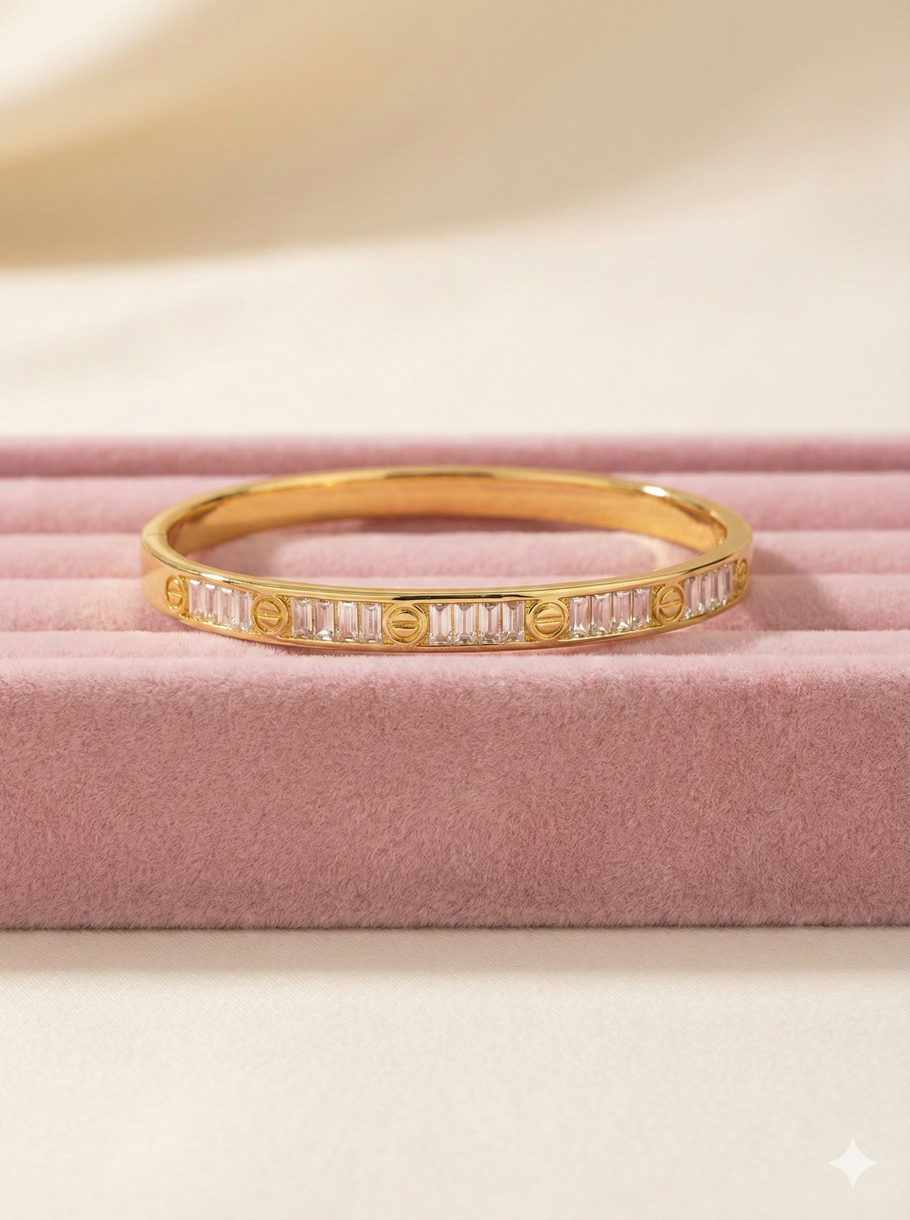 Designed with a row of sparkling baguette-cut stones and signature screw-style details, this bracelet blends luxury-inspired aesthetics with modern minimalism.