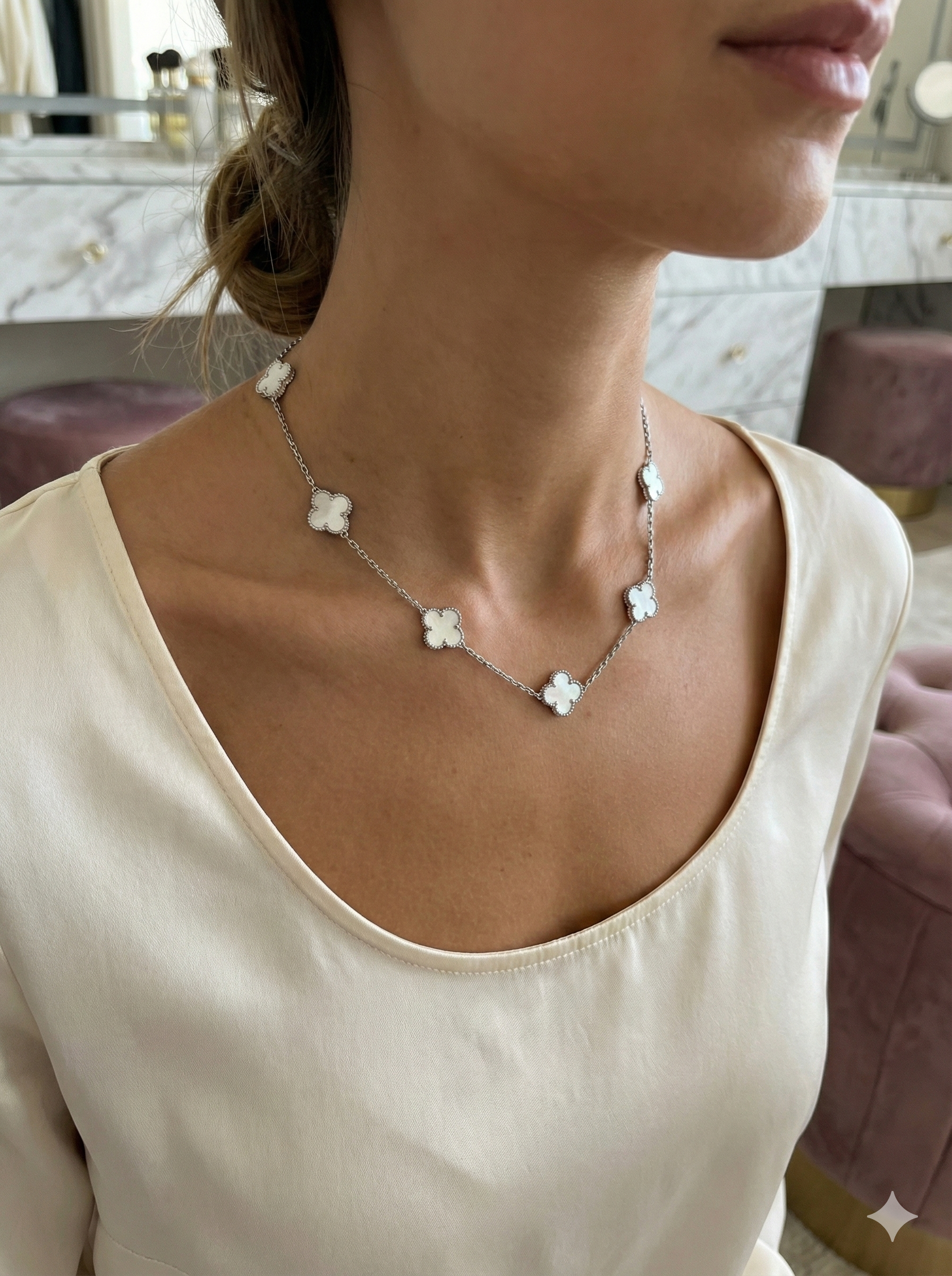 Silver Stainless Steel Mother-of-Pearl Clover Necklace – Double Clover Pendant – Zircon Pavé Lucky Charm – Waterproof & Hypoallergenic