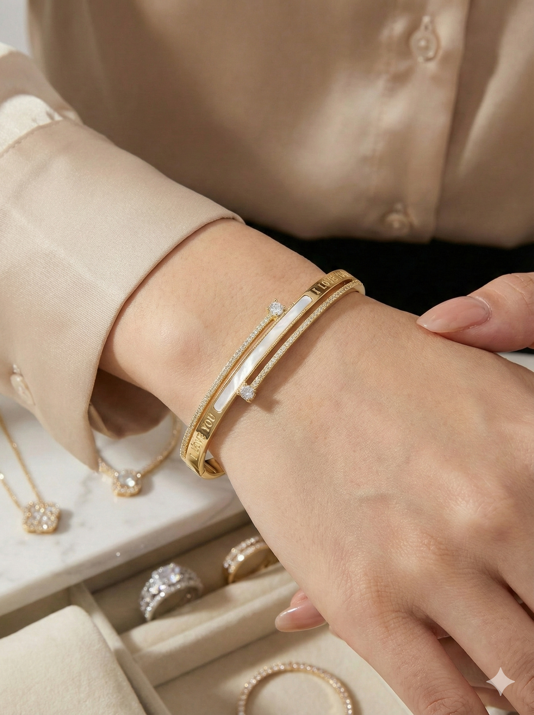 Gold Stainless Steel Mother-of-Pearl Inlay Bracelet – ‘I Love You’ Engraved Romantic Bangle – Zircon Detail – Waterproof & Tarnish-Free