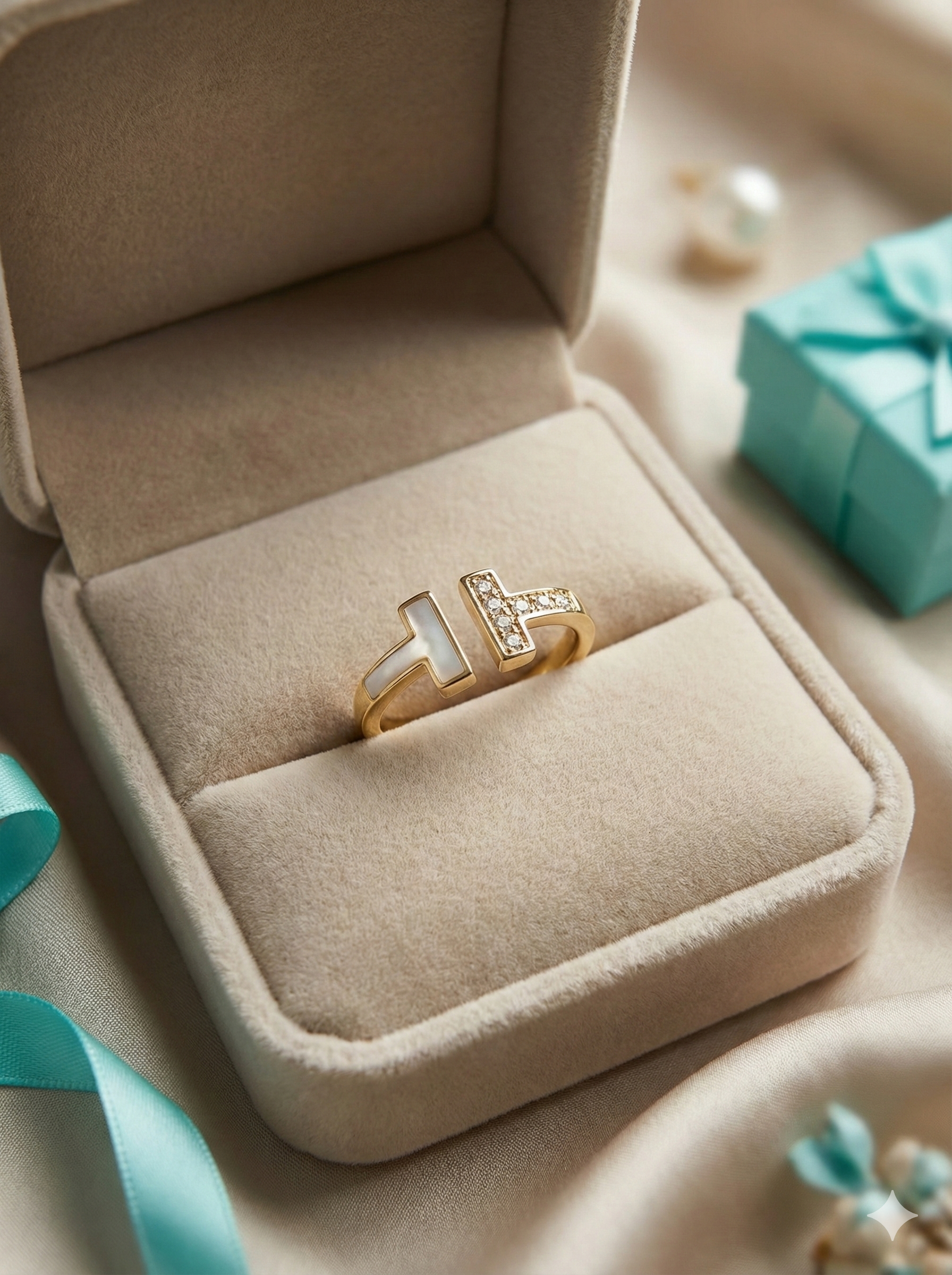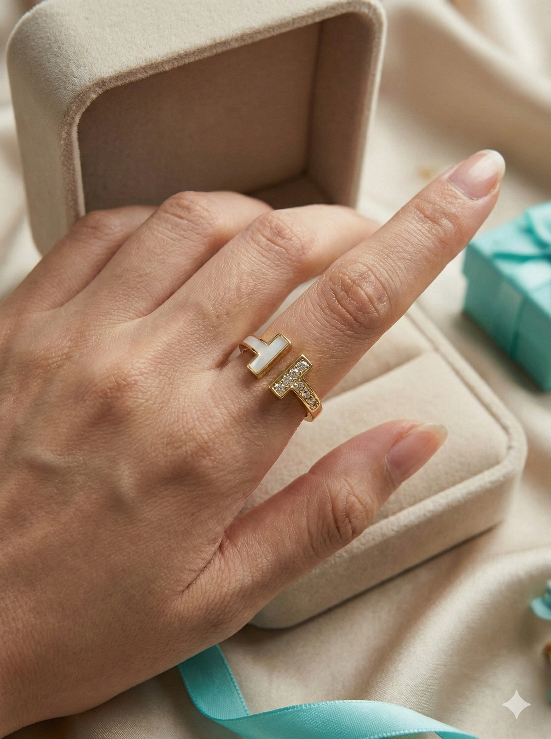 This stunning Minimalist T Ring is crafted with a sleek 18K gold–plated band, featuring a modern T-shaped mother-of-pearl inlay paired with a sparkling pavé crystal bar. Its clean, architectural design makes it the perfect piece for lovers of minimalist and luxury-inspired jewelry.