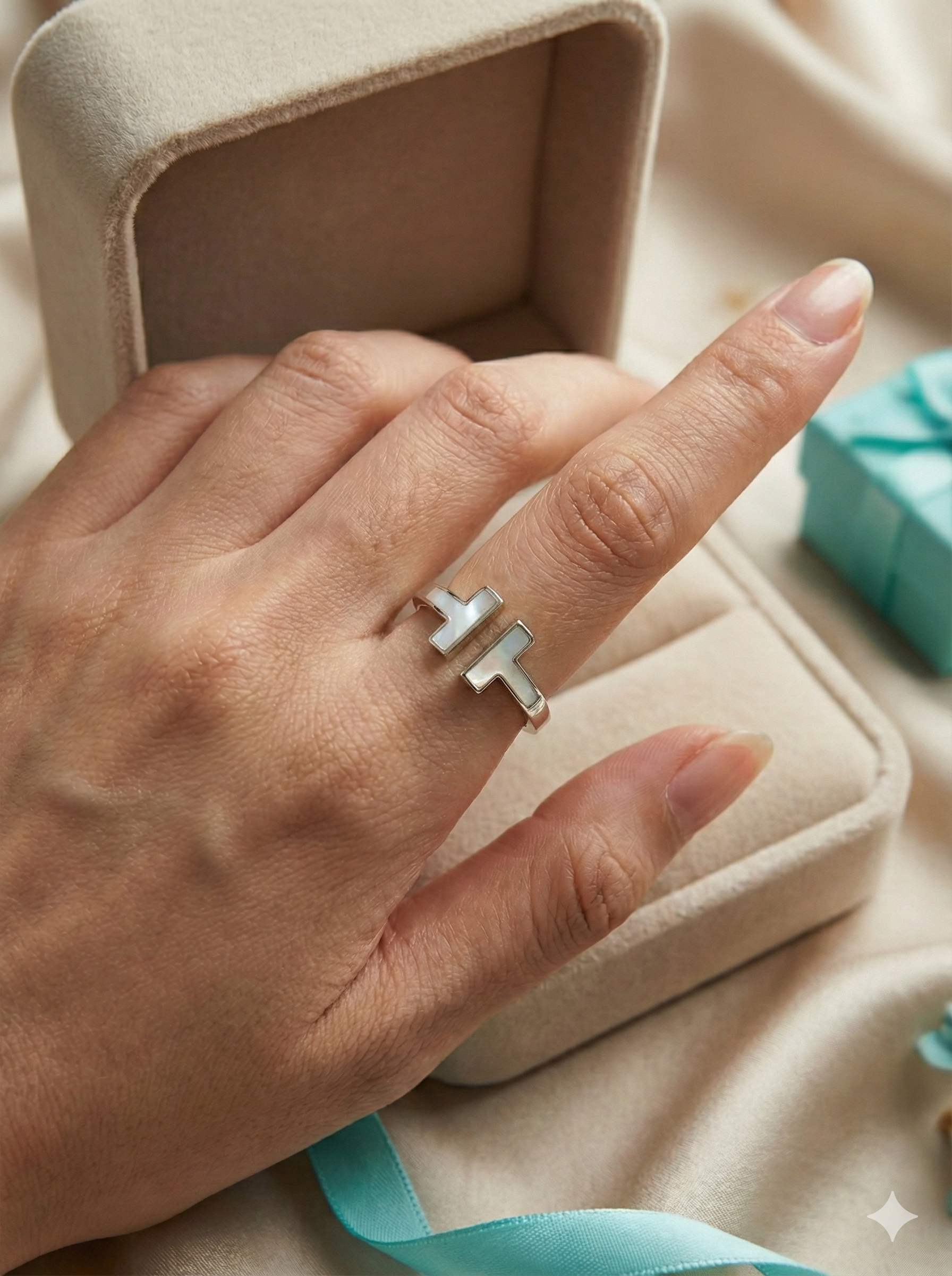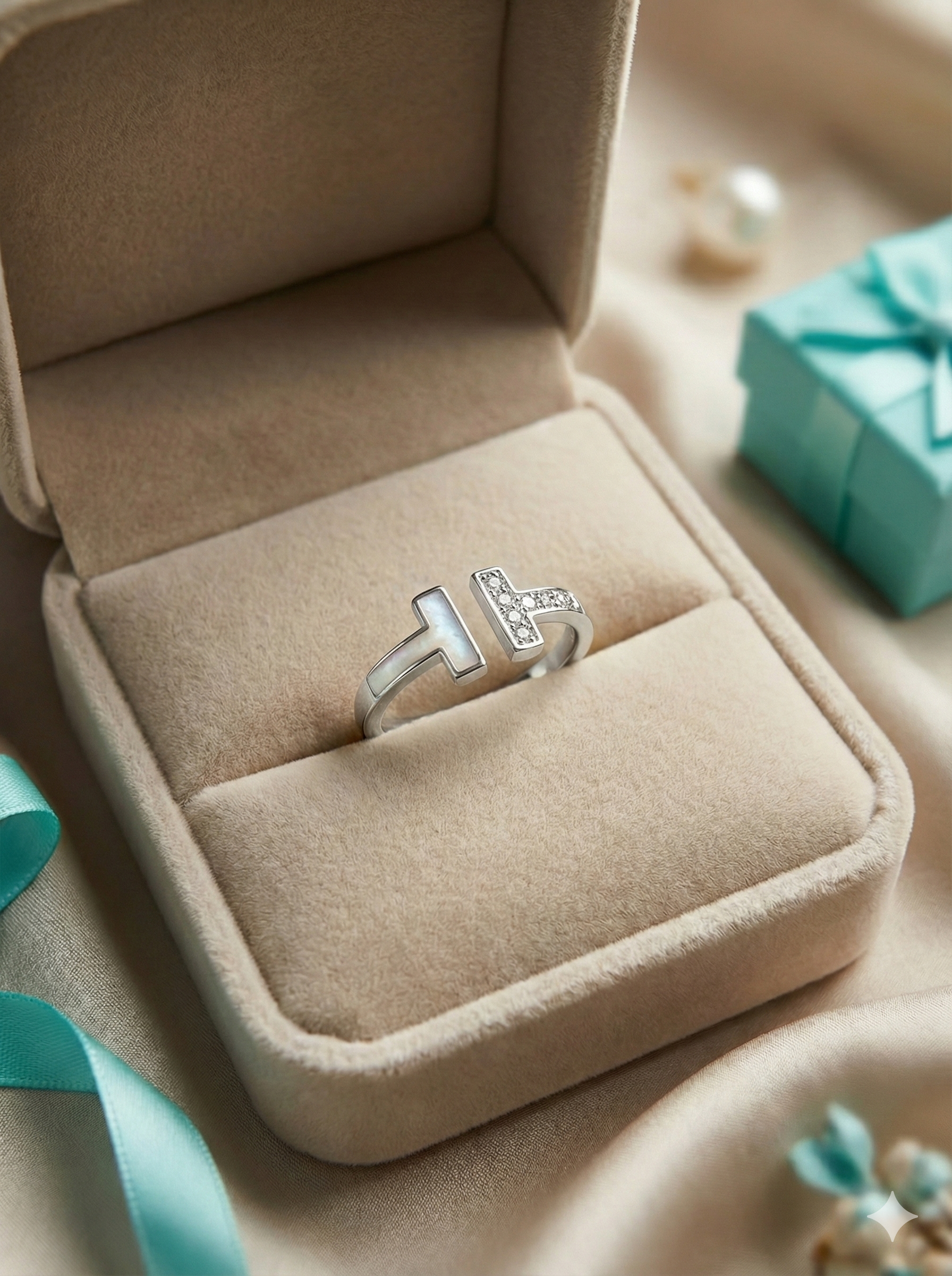 This stunning Silver T Ring blends minimalist design with a touch of modern elegance. Crafted from premium waterproof stainless steel, it features a sleek open-band silhouette with a luminous mother-of-pearl T detail on one side and sparkling pavé crystals on the other.