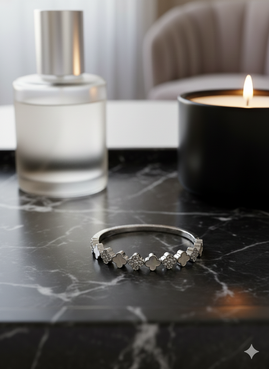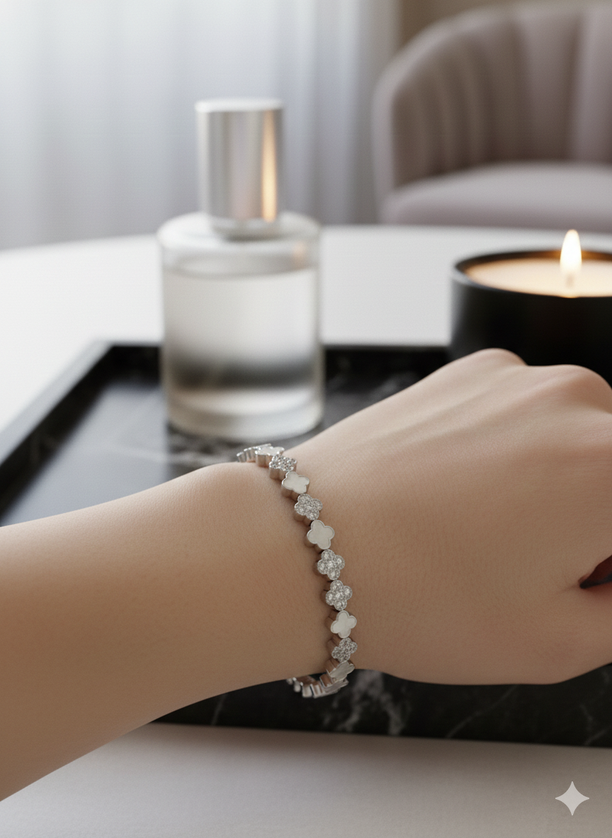 Silver Stainless Steel Mother-of-Pearl Clover Bracelet – Full Zircon Clover Tennis Bracelet – Waterproof & Tarnish-Free