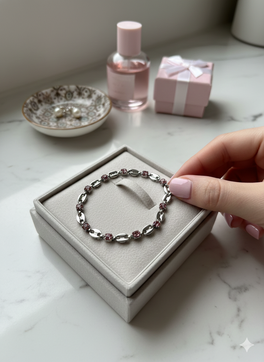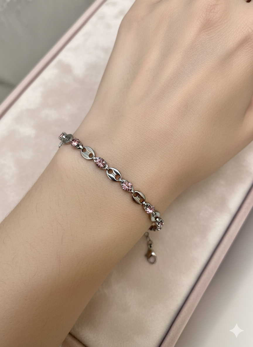 Silver Stainless Steel Pink Zircon Bracelet – Elegant Chain-Link Design – Adjustable & Tarnish-Free