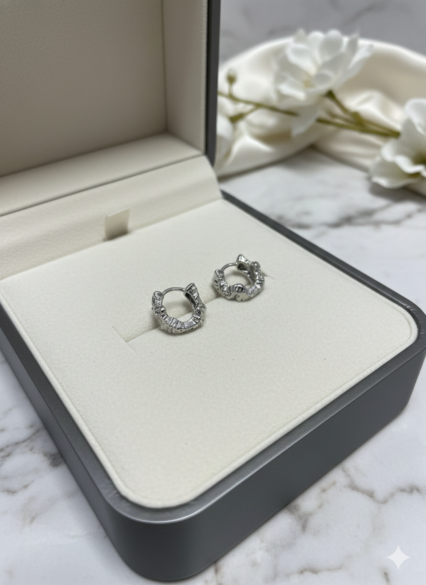 Silver Textured Zircon Huggie Earrings – Organic Shape Mini Hoops, Non-Tarnish Stainless Steel Sparkly Earrings