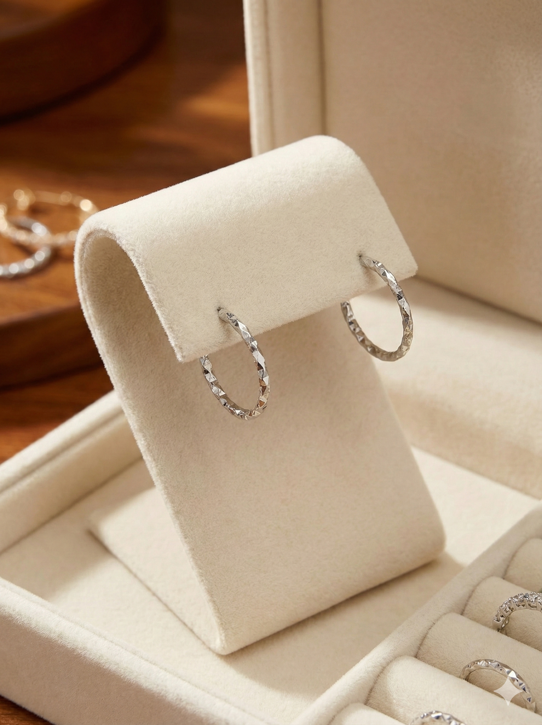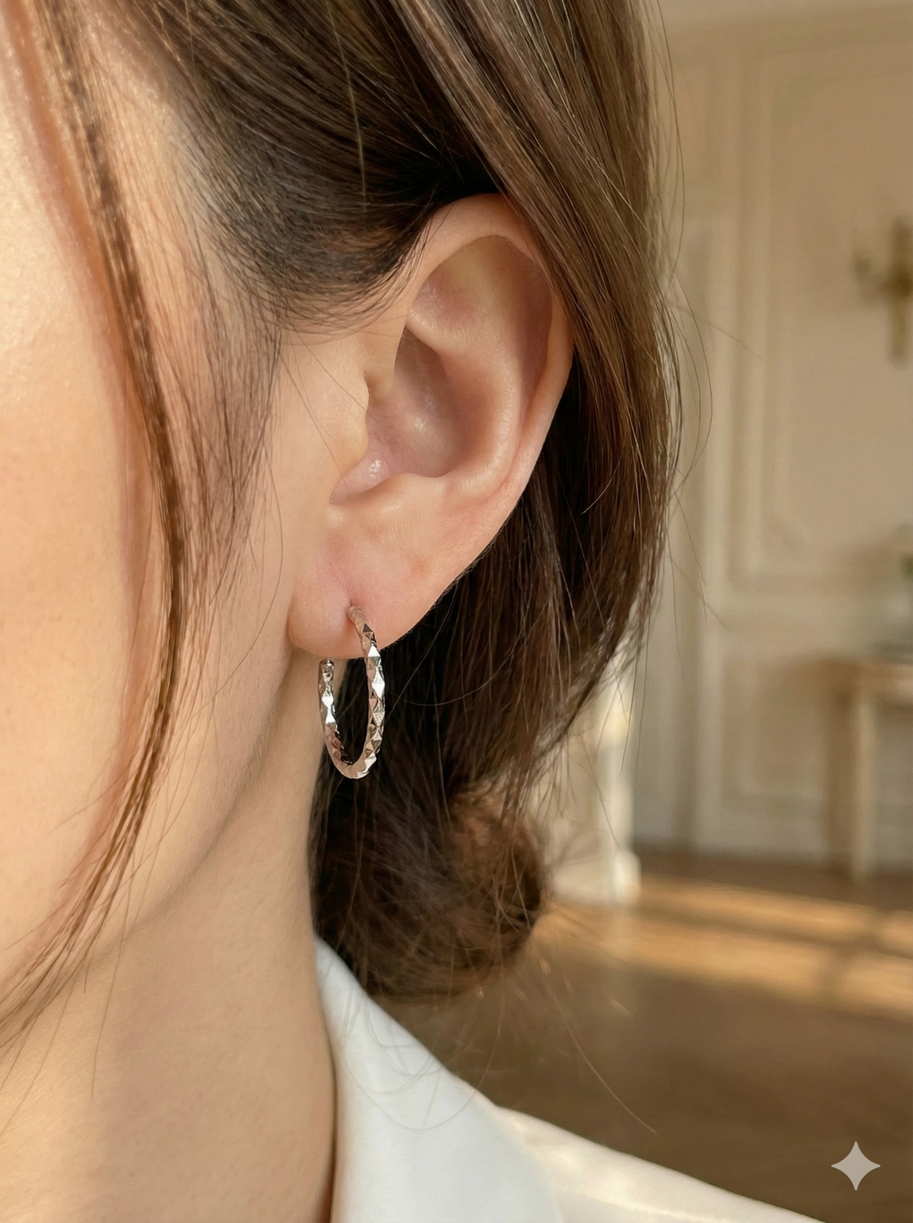 These Faceted Sterling Silver Hoop Earrings are designed for women who love a minimal yet eye-catching shine. The textured, diamond-cut surface reflects light beautifully, giving the hoops a luxurious and modern sparkle.